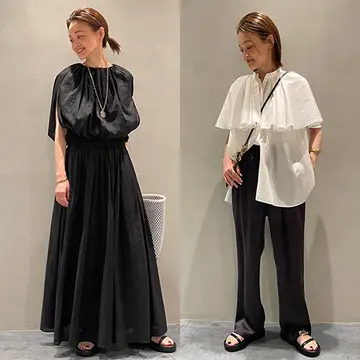 シルクの上品なツヤとリネンの涼やかさが合わさったオーガンジーのブラウス。デコラティブなフリルのデザインも、黒だと適度なシャープさが加わる。そこに夏らしい抜け感を与える白を、つば広ハットなどハンサムなアイテムで投入することで、コーディネート全体がぐっとこなれた印象に。