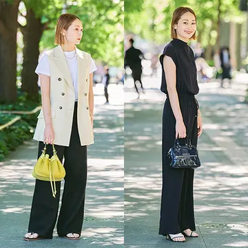 ふんわり広がる白スカートはマットな生地感で、ほどよい甘さが使いやすい1着。合わせた黒ジレのマニッシュさと、スカートのフェミニンさとのギャップが大きなりすぎず、ちょうどいい甘辛バランスに。