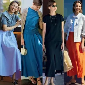 着丈短めでトレンド感のある半袖シャツと、おなかまわりを適度にカバーしてくれるタック入りスカートのセットアップ。フェミニンなボルドーカラーが全面に出るぶん、足元はフラットサンダルでラフな抜け感を出すと今っぽく仕上がる。
