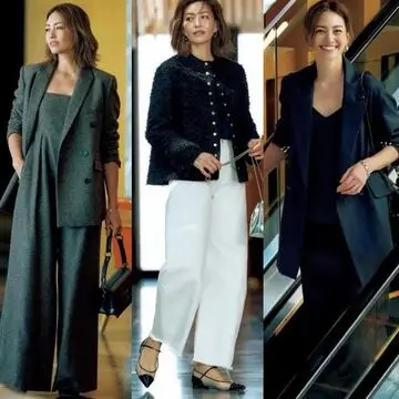 シックなキャメルにハンドステッチの襟やポケット、美しいショルダーライン。大人のエレガンスがきわだつジャケットとパンツは、身につけるだけで自信を与えてくれる存在。ジャケットのVゾーンから、シアーニットの繊細なニュアンスをのぞかせて、上質なセットアップにフェミニンな抜け感を加えるのがおしゃれ。