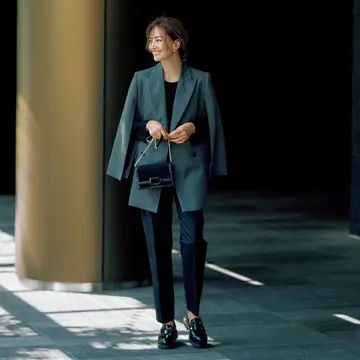 マニッシュなジャケットコーデは、革靴からスニーカーに変えることでラフさが出てこなれ感がアップ。温かみのあるスエード素材×渋いトーンの配色で、足元からも秋のムードを。