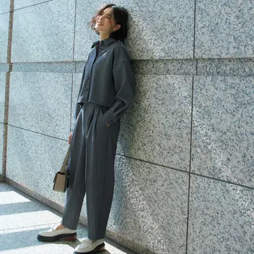 無機質なグレーがスマートな印象をもたらすオールインワンに、温度感のあるブラウンのジャケットを羽織る。スマートなかっこよさは保ったまま、程よくフェミニンさが香るバランスが新鮮!