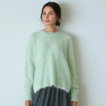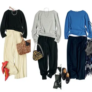ニットとゆるパンツのカジュアルなスタイリングも、やさしいトーンでまとまれば女性らしい華やかさが手に入る。カシミヤ混の肌ざわり抜群のニットは、ベーシックな形でありながら、袖だけふんわりさせたバランスが新鮮で、大人にちょうどいい甘さを加える。