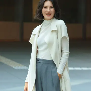 華やかさと清潔感のある白のプリーツスカートを合わせるだけで、カジュアル度高めなグレーのカーディガンも大人の女性にちょうどいいバランスに。肩の力は抜けているのに女性らしい雰囲気がおしゃれ。