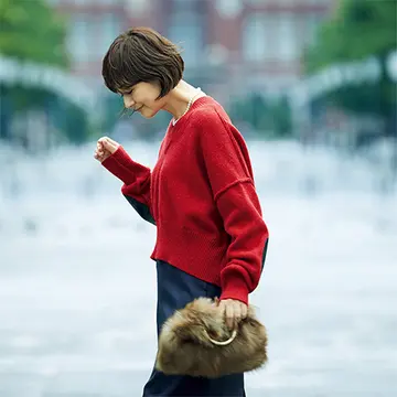 最高気温が一桁台に突入した日は、コートやストールを身につけるから、中のコーディネートはすっきりとワンツーコーデに。大きく開いたデコルテときらめくニットが、顔まわりをパッと明るく見せてくれる。上半身で女っぽムードを醸し出すなら、ボトムはマニッシュなパンツが好相性。