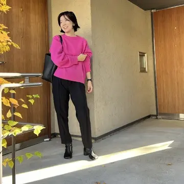 ニットの着心地のよさとジャケットのきちんと感の両方を楽しめるカーディガンは、気負わず過ごしたい休日のお出かけコーデにぴったり。ゴールドのメタルボタンが上品なアクセントになり、小物で盛らずともおしゃれに仕上がる。