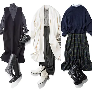 ムートンジャケットのボリューム感とIラインスカートのコントラストで、下半身をよりすっきり見せる。さらに、スカートのスリットからのぞくロングブーツのストレートなシルエットでより美脚効果がアップ!