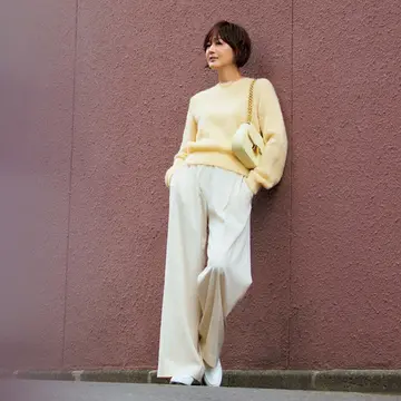 【富岡佳子さんのマイスタイル】トレンドの短丈ニットにマニッシュパンツをさらりと合わせて