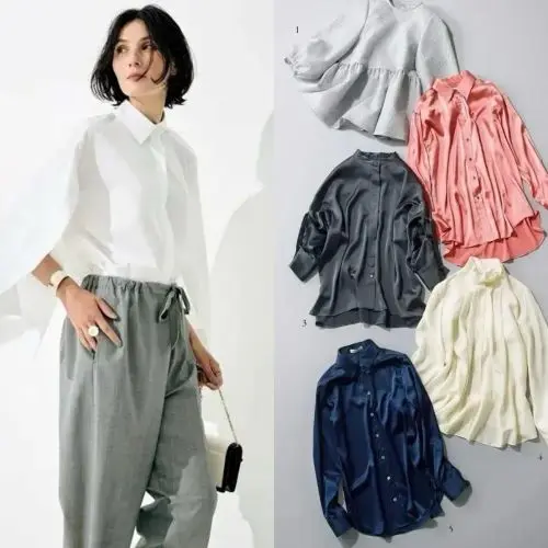 ほのかな光沢感と優しい張り感をもつシアーブラウスは、控えめな色っぽさとデイタイムのお出かけにちょうどいい清潔感を印象づけてくれる。大きなカフスやフロントポケットによる立体的なフォルムが、たたずまいを美しく引き立て、シンプルなワンツーコーデも華やかな雰囲気に。