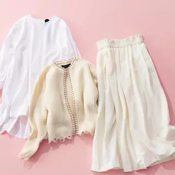 袖から後ろヨーク部分までレースがあしらわれたデザインニットは、プレーンなパンツに合わせるだけでぐっと華やかに! 柔和な印象のオフホワイトのカラーが大人にちょうどいい甘さを与えてくれ、春の訪れを感じさせるコーデが完成。
