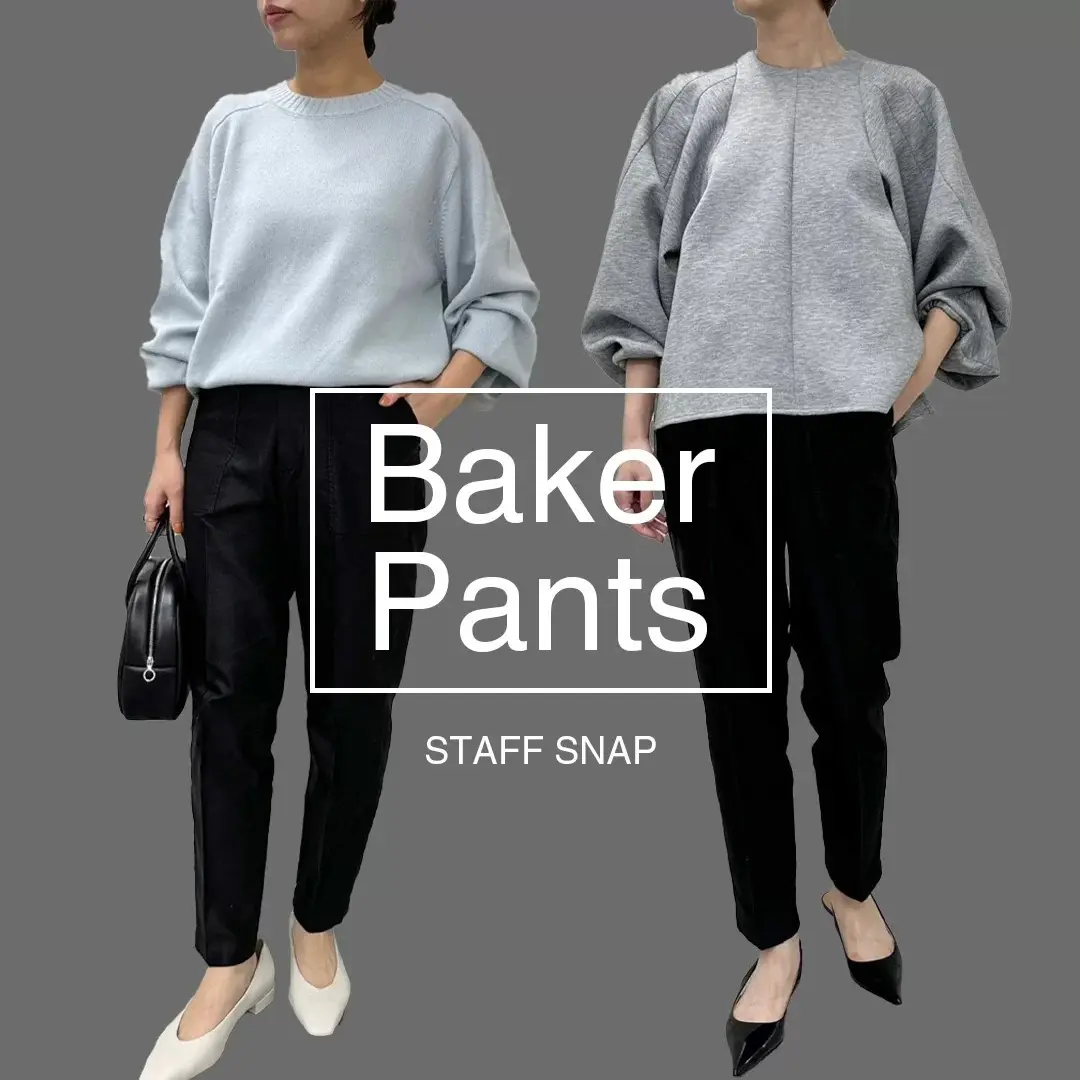 すっきりしたテーパードシルエット、微光沢素材やセンターラインで、きれいめに着こなせるベイカーパンツ。ポインテッドトゥの黒パンプスを合わせて、足先まですっきりした印象をつなげることでさらなる美脚効果が狙える。