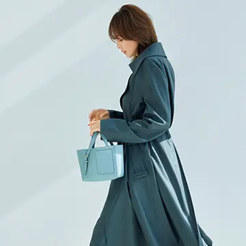 穏やかな春の空気を感じさせるライトブルーとクリームの2トーン配色に。ワイドパンツとロング丈のスプリングコートで華やかなシルエットを作ると、シンプルな通勤コーデに今っぽいムードも加わる。