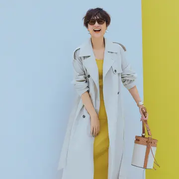 すそにボリュームをもたせたドレスコートは、やや高めの位置のウエストマークで、品よくメリハリのあるスタイルを演出。パンツと靴を同じクリーム色で揃えることで、さらなるスタイルアップも狙って。