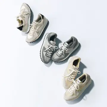 ピンクカットソーに肩がけした白ニットの組み合わせと、白×パステルカラーのスニーカーで、春らしい配色を散りばめた着こなし。清潔感と遊び心が感じられ、シンプルなのに街でもひときわ映えるコーディネートに仕上がる