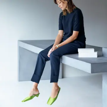 ポインテッドトウや華奢なストラップで足を美しく演出するミュールを履いて、プレーンな黒ニットとグレースカートのモノトーンスタイルを女性らしい雰囲気を醸成。ミニマルなスタイリングだからこそ、繊細な足元が引き立ちエレガントなムードを獲得できる。