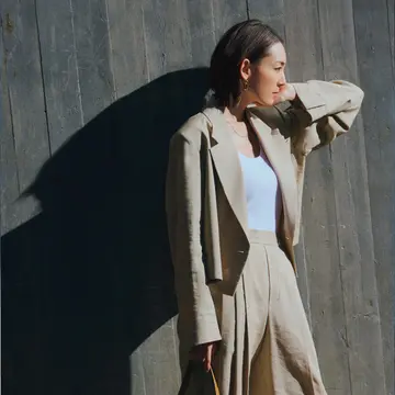 モダンなクロップドジャケットをオーセンティックなセットアップで取り入れ、新鮮なインパクトを演出。インナーはTシャツでカジュアルな抜け感をつくって、こなれたムードをプラスして。