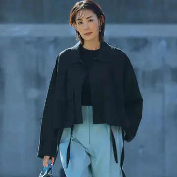 単調になりがちな無地のマキシワンピースは、今年らしい丈短のブルゾンと合わせてシルエットにメリハリを出して。ほんのり辛口な要素も加わり、リラクシーな雰囲気も引き締まってしゃれ感も上昇。