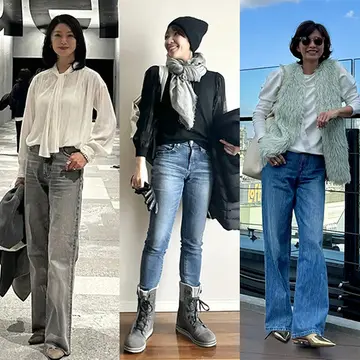 きれいめなトラウザー感覚で履ける濃紺デニムとなら、鮮やかなオレンジニットも品よく着こなせる。ニットの裾はインして上半身をコンパクトにまとめ、カーディガンを肩掛けすることでスタイルアップもかなう。