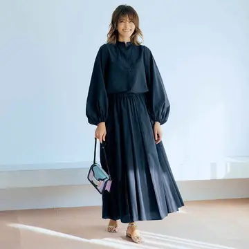 上質なシルク100%素材ならではの光沢感と、優雅に揺れる袖のスリットデザインのおかげで、落ち着いたダークネイビーのコーディネートもエレガントな雰囲気に。