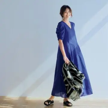 気温27℃のすっかり暑い日は、鮮やかなブルーのワンピースで初夏のおしゃれを謳歌! 派手さはおさえつつもエレガントさを加味できる、光沢感のあるベージュのブルゾンを合わせて、リゾートライクに傾きすぎないモダンな装いを楽しんで。