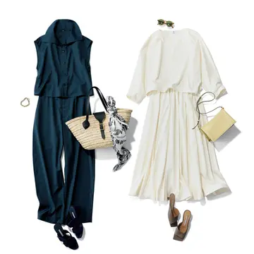 大きめシルエットのシャツと、タイトスカートのメリハリのあるバランスで洗練を約束してくれるセットアップ。黒ではなくブラウンのサンダルやストールを引き締め役として投入し、穏やかなメリハリをつけるとこなれ感が増す。