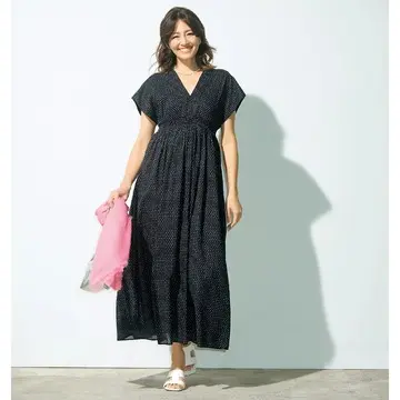 後ろ身頃にボリュームのあるコクーンシルエットで、 自然に体型の難を隠してくれるワンピース。スリットが長めに入っているので、ロング丈でも風通りがよく、蒸し暑い日にもぴったり。ボリューム感のあるデザインのレザーサンダルで、足元にアクセントを効かせてこなれ感を演出して。