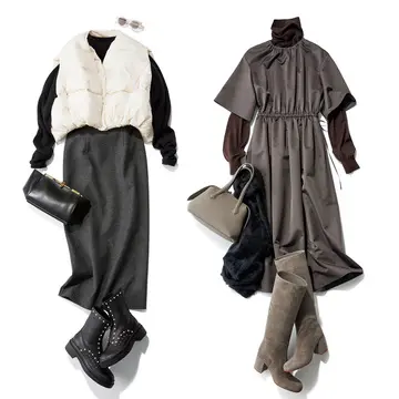 カシミヤニットやウールパンツのリュクスな素材をつなげたベージュのワントーンコーデに、攻めた大人のスパイスをプラス。大ぶりのスクエアバッグやベルトデザインがロックなブーツで、辛口な黒を配すれば、上級なおしゃれさをアピールできる。