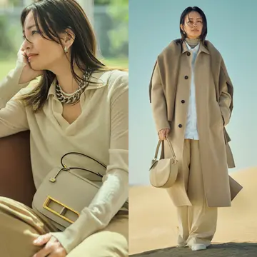 ベージュのグラデーションと今季らしいオーバーサイズのシルエットで、やわらかな雰囲気をまとった装いに。ミルクティーのようなまろやかなトーンのコーデも、真っ白なコットンシャツを間に挟むと、のっぺり感なくメリハリあるスタイルに仕上がる。