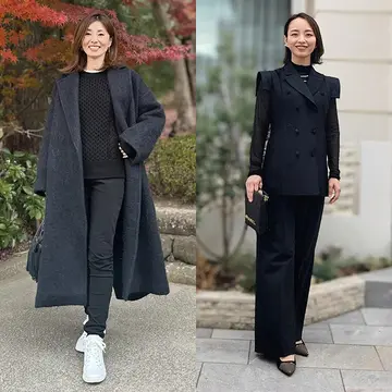 ハリコシのあるウール素材とシアーなニットという質感の差。さらに、大きな襟がふわりと動くショートコートとタイトなロングスカートのメリハリをつけたシルエット。ダークトーンのコーデの中に幅を出すことで、大人のこなれ感を演出できる。