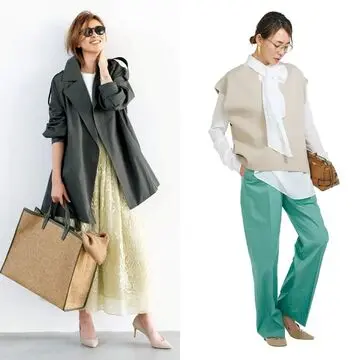こなれたニュアンスのあるシックなカラーとして人気のカーキのセットアップを、黒コートの額縁でスタイリッシュに引き締める。バッグと靴もカーキと黒で統一しシンプルにまとめることで、大人らしさを高めて。