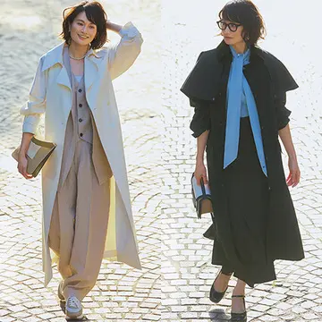 風になびくロング丈、袖口の幅広タブなど現代的なディテールを取り込んだベージュのトレンチコートは、目を引くピンクカラーパンツを合わせて、ドラマティックな装いにアップデート。トレンチのクラシックさによって、トレンドの鮮やかピンクも大人顔で着こなせる。
