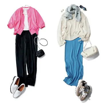 上質なツヤ感でクリームイエローがいっそう華やかに映えるとろみパンツを軸にコーディネート。トップスのシアーな白でフレッシュさを加速させながら、柔らかなブラウンのコートをさらっとはおって程よくシックなムードにまとめることでこなれ感が高まる!
