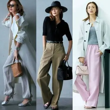 スポーティなナイロンが定番のすそ絞りパンツも、素材をリネンに切り替えるだけで上質でラグジュアリーな印象に変化。さらにパンツのサンドベージュカラーとトーンを合わせたアイボリーのコートや白のカットソーとコーディネートし、淡色のグラデーションを作ることで大人にこそ似合うクリーンな品格を主張した装いに。
