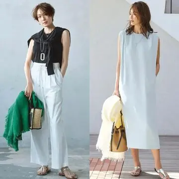 吸汗、速乾、ストレッチ性に優れた多機能素材を使用したブラウスに、撥水と速乾、UVカット加工付きのパンツという、酷暑を快適に過ごすためのコーディネート。着心地重視のシンプルな装いも、ブラウスの立体的なシルエットやパンツのきれいなテーパードのおかげで上品さを感じさせることができる。