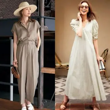 ベージュのリネンオールインワンは、肩山を覆うような袖やローライズなウエストなど、大人の女性の体型に配慮したディテールを備えたデザインが秀逸。しなやかで肌離れがいい、ドライタッチの麻素材を使用しているため、蒸し暑い日でも快適。カジュアルな印象のオールインワンにクラシカルなスカーフを巻いて、小粋なたたずまいへと導いて。