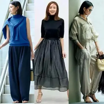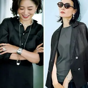 ボディラインを拾わないリラクシーなシルエットと、胸元の知的なピンタックのディテールの融合によって、1枚で簡単にこなれ感を演出できるコンビネゾン。コンビネゾンのミッドグレーを軸に、黒バッグとシルバーバングルの小物でグラデーションを作るような配色に仕上げるのもシャレ感アップにつながる。