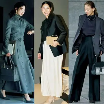 ビジネスシーンで品格とシャレ感を両立するなら、最旬デザインのスリーピースがおすすめ。マニッシュなシルエットのジャケットとパンツに対し、ジレは甘やかなペプラム仕様。この絶妙なバランスが、着こなしの鮮度を高めてくれる。