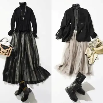 繊細なつやめきと透け感を持つオーガンジー素材のプリーツスカートと、端正なブレザーを合わせて、品格を感じるグレートーンの装いに。バッグとブーツは黒を選べば、ぼんやりした印象になるのを回避しながら、コーディネートに奥行きを生むことができる。