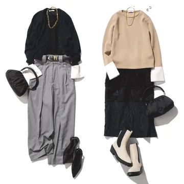 ゆるニットとふんわり広がるオーガンジースカートの糖度高めになりがちな組み合わせも、配色で大人に似合うモードな印象を獲得できる。鮮やかな赤と、凛とした黒の強い色同士を掛け合わせで、辛口なかっこよさを演出して。