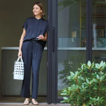 「ラフな印象のベイカーパンツですが、艶感のある素材ときれいめなシルエットが大人っぽく着られます。きれいめトップスを合わせて女性らしさをプラスした着こなしがオススメ!」