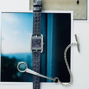 シルクバンダナ55(ブラック)「コーラス・ステラルム」・(ブルー)「オール・アボード!」各¥37,400・時計¥188,800/エルメスジャポン(エルメス) ジレ¥82,500/ポステレガント シャツ¥41,800/ADORE