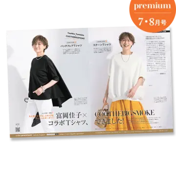 【モデル 富岡佳子さんより】「ジャージー素材にこだわり、大人の女性のための妥協しないものづくりが特徴の”コグ ザ ビッグスモーク”と、個性的なTシャツ2型をコラボしました。ベーシック好きな私にとってTシャツは、装いに欠かせないエッセンシャルアイテム。そんな私が、常日ごろTシャツを選ぶ際にこだわっているポイントを具現化しました。最も重要視するのはクルーネックのシルエット、そして、上質感と抜け感が両立する素材。今回の2型はともに、その2つのこだわりをきっちりクリア! さらには、暑いときもあれこれ考えないで、一枚着るだけで大人に必要な華が手に入るシルエットもお気に入りです。2型ともスカートもパンツも合わせやすく、ボディラインをカムフラージュしたい人にもおすすめです。」