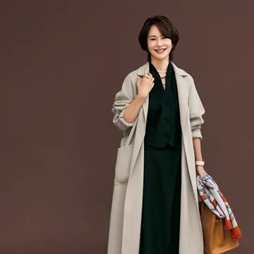 ●コート/ル フィル ニット/ビアッジョブルー パンツ/エンフォルド スカーフ/エルメス バッグ/ピエール アルディ 靴/オデット エ オディール