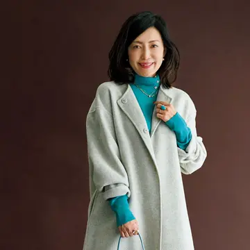 「クロゼットで眠っていたコートをメンズライクなコーデでブラッシュアップ。ブルーを引き立てるため、加える色はモノトーンのみ。オリーブをモチーフにしたマットシルバーのアクセサリーで女らしさを添えます」。
