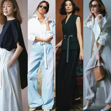 フリル袖の白ブラウスは、円熟した大人が着ることで“おしゃれな甘さ”が引き立つ。清楚かつドラマティックな魅力をくずさないよう、タックパンツはライトベージュのリネン素材を選択。ほんのりハンサムな表情を加えながら、全体のムードはあくまでも優美に。パンツはウエストサイドがゴム仕様で、ストレスフリーな着心地も夏にうれしいポイント。