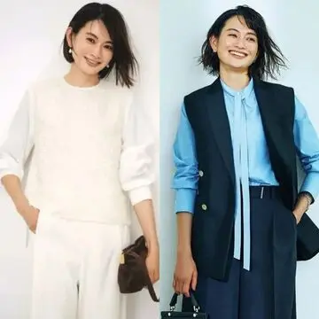 定番のツインニットは短め丈を選ぶことで、今っぽく新鮮なバランスに。ストンと落ちる縦ラインが美しいパンツと合わせれば、オフィスにも適したきれいめな印象に仕上がる。