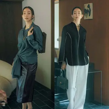 夏の名残を感じつつ、秋の気配が漂い始める9月初旬〜中旬。そんな季節の変わり目には、軽やかな素材と落ち着いた配色で、品よく整えたスタイルが心地いい。「Room no.8×eclat」の別注リブスカートは、前はミニマル、後ろにはボタン付きスリットで動きに表情を添える一枚。肌ざわりの柔らかな素材と、ゆったりとしたウエスト設計で、気温の変化にも快適に対応します。トップスには、リボンが華やかな白ブラウスを合わせ、ゴールドのカーディガンを軽く羽織って秋らしさをプラス。足元はアイスグレーのポインテッドトゥシューズで端正にまとめ、ベージュのミニバッグで柔らかさを添えて。シンプルながらも華やぎのある、大人のきれいめスタイルが完成します。