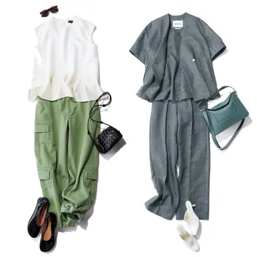 フリル袖の白ブラウスは、円熟した大人が着ることで“おしゃれな甘さ”が引き立つ。清楚かつドラマティックな魅力をくずさないよう、タックパンツはライトベージュのリネン素材を選択。ほんのりハンサムな表情を加えながら、全体のムードはあくまでも優美に。パンツはウエストサイドがゴム仕様で、ストレスフリーな着心地も夏にうれしいポイント。