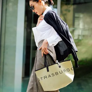 絶賛発売中のエクラ10月号の特別付録は“ストラスブルゴ”のロゴを大胆にあしらったトートバッグ。落ち着いたオータムベージュが秋の気分にぴったり。メインバッグとしてもサブバッグとしても大活躍間違いなし!アラフィー読者ブロガーの秋をイメージしたコーディネートを早速チェック。