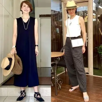 黒は苦手意識があってあまり持っていないのですが、やはり夏の黒は素敵で憧れます。エンフォルドのワンピースにセオリーのワイドパンツでレイヤードコーデにリボンが黒の帽子を合わせて。